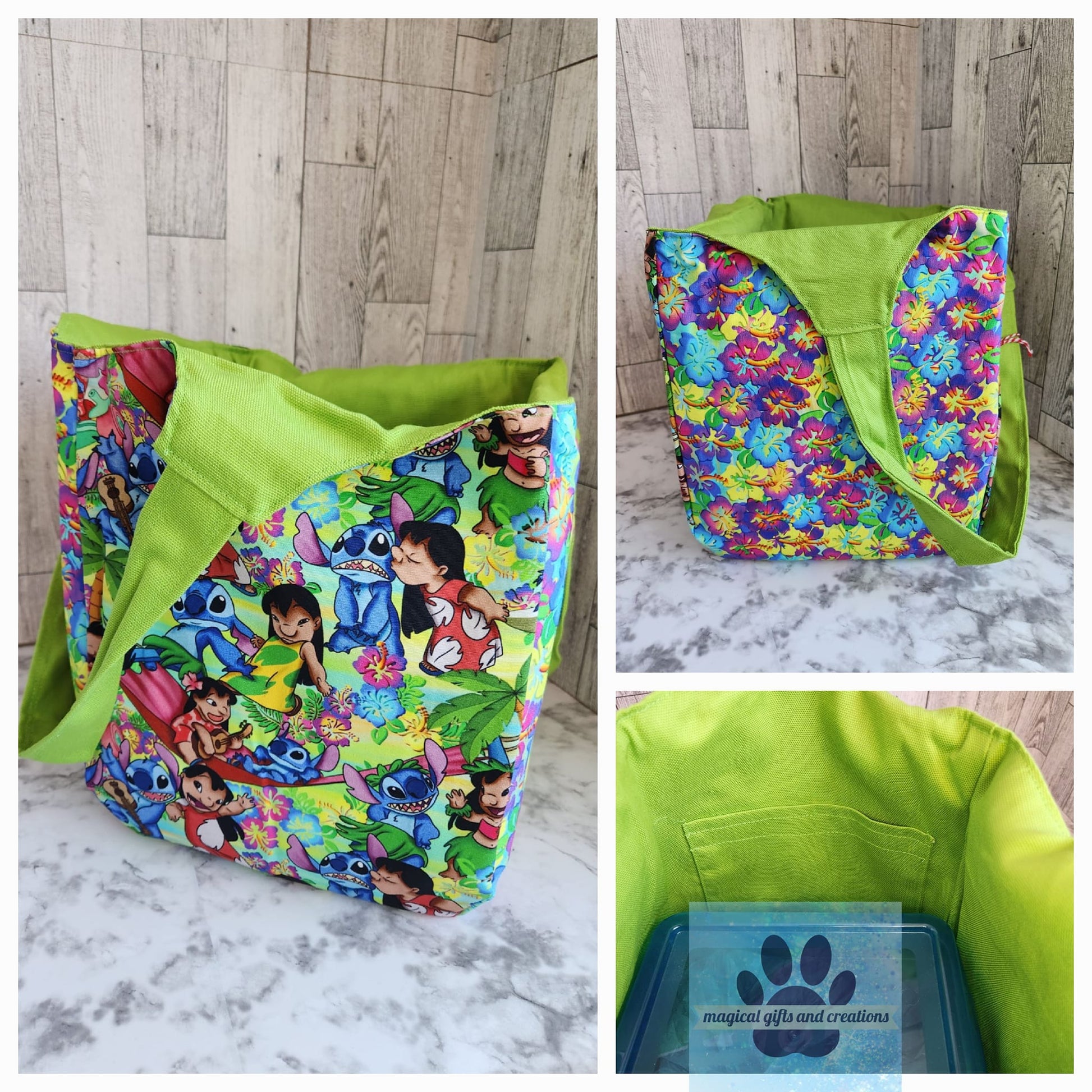 This bag can be constructed with one of 3 interfacing options. Interfacing is the inner fabric support. Stiff interfacing, is 2 layers of a heavier interfacing. It will stand by itself and hold its shape well, but will require more ironing to smooth wrinkles. Light interfacing is a single layer of a lighter interfacing. It will still stand by itself and hold its shape, but has more flexibility. No interfacing, will not stand on its own or hold its shape, however can fold down even more to be even more travel friendly.