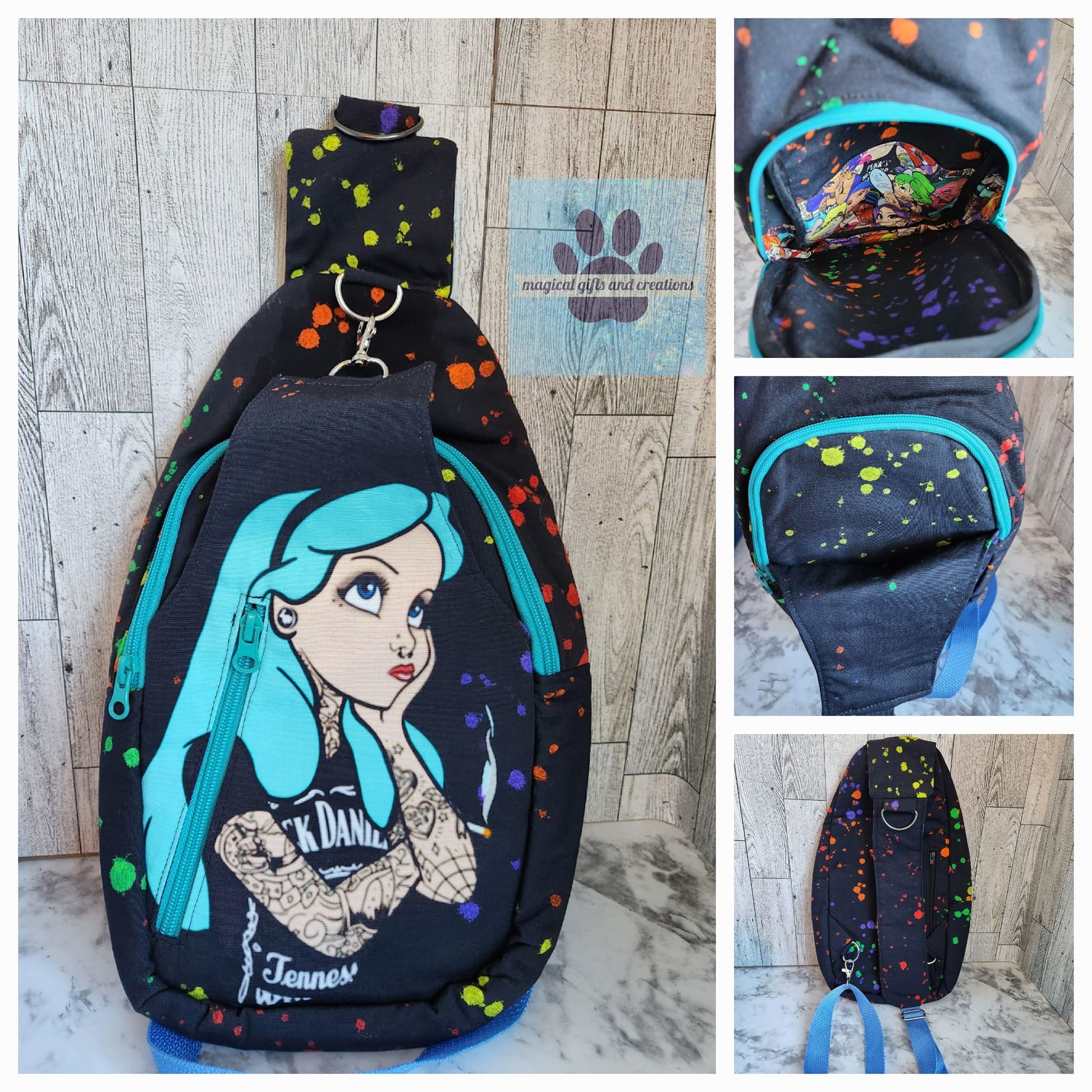 This product bag features an inside slip pocket, a back zippered pocket, a front slip pocket with clip and a large zipper pocket. The strap can be connected to either side making it universal for right and left handed use. Made with 100% Cotton. This bag can be machine washed in gentle conditions and thoroughly air-dried, as needed. Use an iron with medium-high heat to smooth any wrinkles after drying.